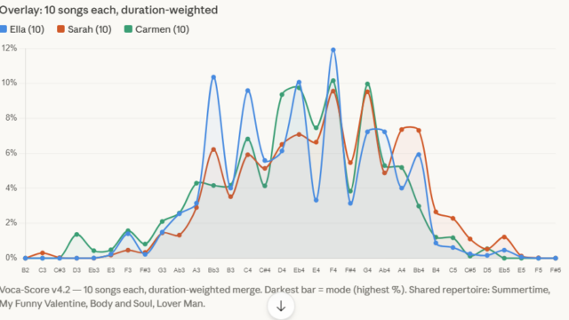 ジャズボーカルにおける表現の違いは、これまで「感覚」や「印象」で語られることがほとんどだった。しかし今回、複数楽曲・長時間データをもとにした音響分析を通じて、非常に興味深い対比が浮かび上がってきた。それはシンプルに言えば——エラは刻み、サラ...